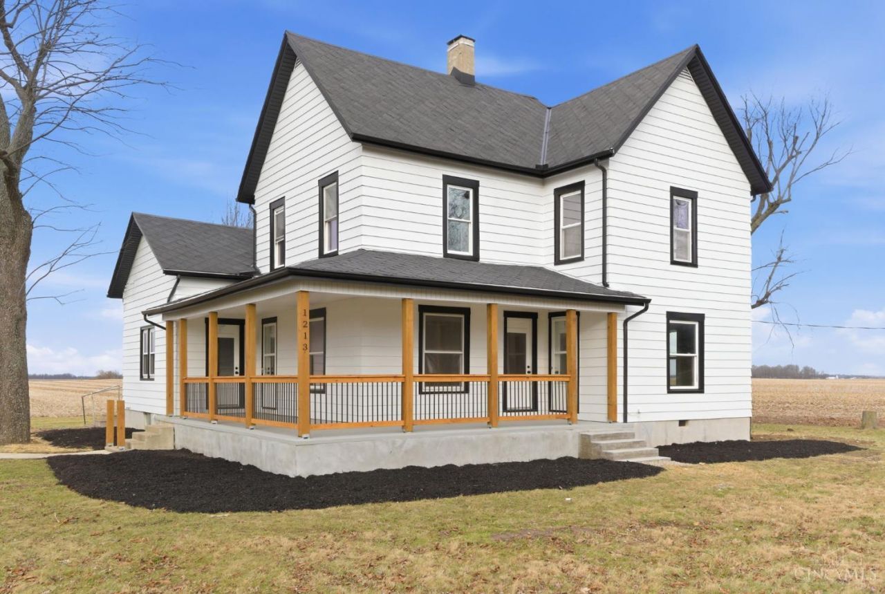 Beautifully renovated vintage farmhouse set out in the country with wide-open views for miles, yet still convenient to the interstate, offering approximately 2,100 square feet on 5 acres in the National Trail School District. A gorgeous updated wraparound porch welcomes you inside to refinished original wood floors, fresh paint, and classic farmhouse charm paired with modern updates. Two parlor rooms and a spacious dining room lead to an all-new kitchen with lovely quartz counters and wood-look tile that complements the original wood floors. A first-floor bedroom offers flexible living space, along with a full bath. Upstairs are three bedrooms with new carpet and an updated full bath. The clean, unfinished basement includes laundry, sump pump, French drain, and a new water heater, with updated electric and HVAC. Outside, an early-1900s barn with stalls connects to a three-car garage, ideal for homesteading, storage, or hobbies, in West Manchester, Ohio.