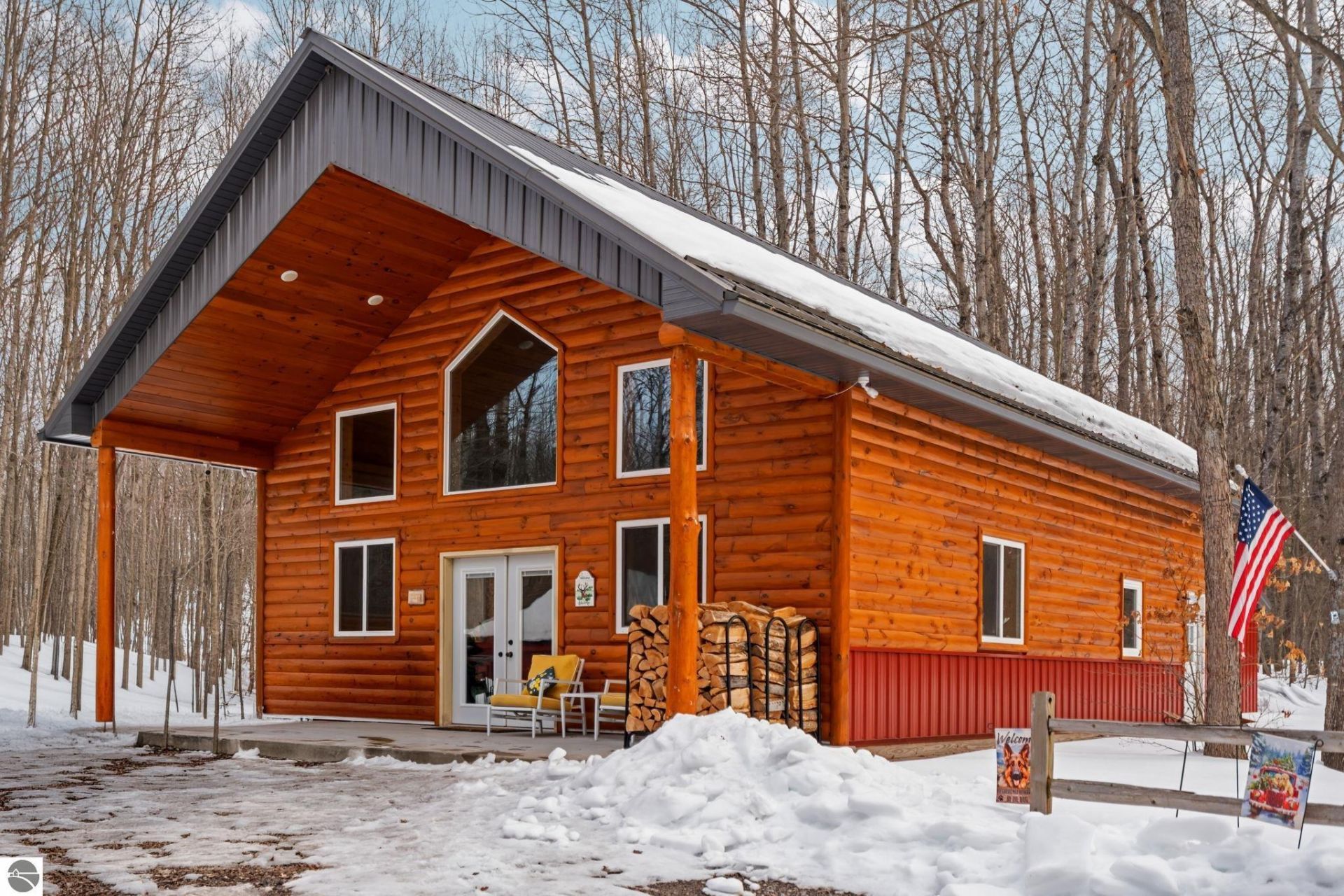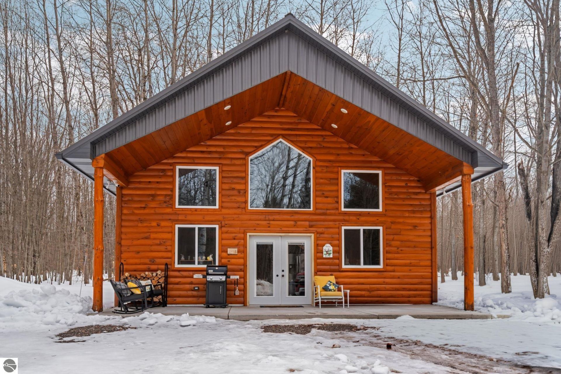 Welcome to this exceptional 2019 custom-built log chalet, perfectly nestled among mature deciduous trees on a serene and private 10-acre parcel just 9 miles west of Grayling on M-72. Whether you're looking for a full-time residence, a Up North getaway, or a turnkey investment property, this one-of-a-kind home checks every box. Offering 1,800 sq. ft. of beautifully crafted living space, this chalet blends rustic charm with modern comfort. The recently upgraded kitchen features brand-new cabinetry, countertops, a new stove, and a new microwave, ready for everything from quiet morning coffee to entertaining guests. The home is being sold fully furnished and move-in ready, including all indoor and outdoor furniture. The attached 2-car garage features a poured concrete floor and offers excellent potential for conversion to additional living or family room space. A separate custom-built storage shed with interior lofts provides abundant room for tools, recreational equipment, and more. The flat, peaceful acreage is ideal for outdoor enthusiasts, nature lovers, and anyone craving a true sanctuary. A 200 ft. chain-link fenced enclosure with a dog house makes this property a dream for pet owners. The integrated security system with three exterior cameras provides year-round peace of mind, whether you're home or away. This is Northern Michigan living at its finest!