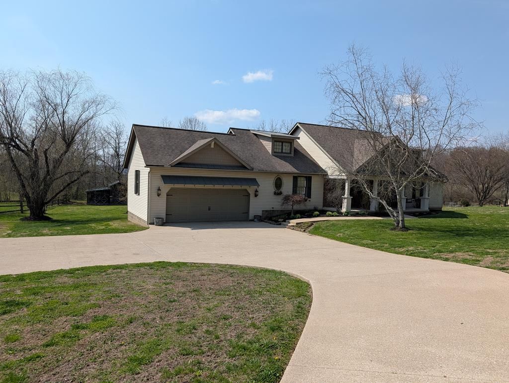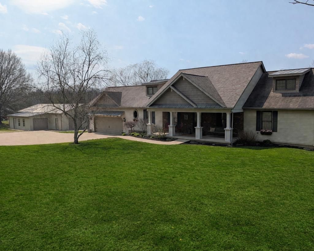 Meticulously maintained 5-bedroom, 3 full bath home on nearly 3 acres, offering exceptional appeal throughout. The main floor features a welcoming foyer, living room with a gas fireplace, and dining room. The updated kitchen boasts white cabinetry with abundant drawer space, Corian countertops, and s/s appliances. A bright sunroom with T&G wood ceilings provides a perfect place to enjoy the views. You'll also find a convenient hall laundry, 3 bedrooms, and 2 full baths on the first floor, including the ensuite. Upstairs offers a spacious area ideal for a family room or office space, along with 2 additional bedrooms, a full updated bath, and large attic storage. Hardwood flooring, dual HVAC systems, closet systems, skylights, and more. Outside there is a covered front porch, attached 2-car garage, covered patio, and partial basement. The 2160 sq. ft. detached garage features space for multiple vehicles, along with heat, water, elect., and concrete flooring. This property has it all!