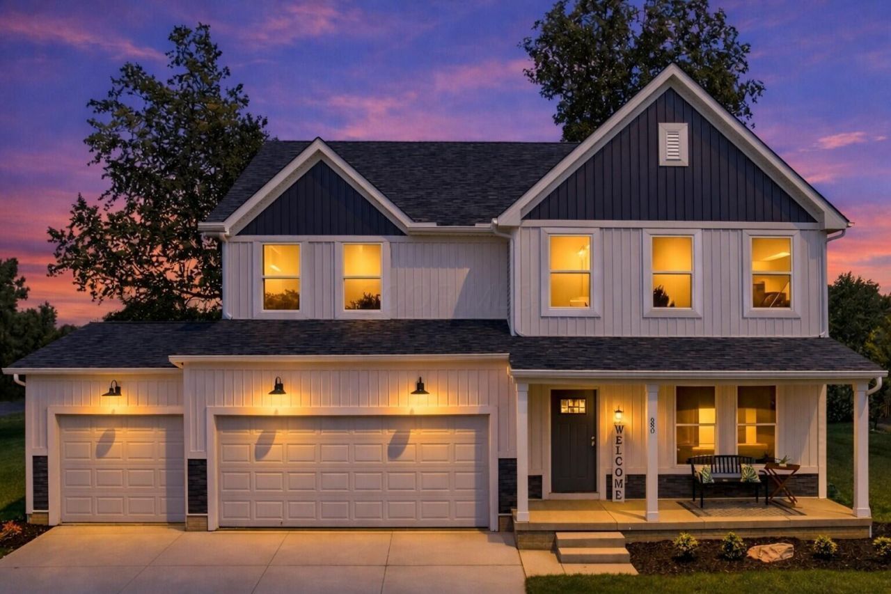 Set on an oversized corner lot just under half an acre and surrounded by mature trees, this beautifully crafted modern farmhouse offers a rare combination of space, comfort, and move-in ready living across 2,801 square feet of thoughtfully designed living space. Featuring 5 bedrooms, 3 full baths, a first-floor mother-in-law suite, a 10-year structural warranty, and elevated finishes throughout, this home delivers modern style and everyday functionality from the moment you arrive.The main level features 9-foot ceilings, an open-concept layout with spacious living and dining areas, a versatile flex room, and a first-floor mother-in-law suite with full bath, ideal for multi-generational living or guests. The chef's kitchen showcases quartz countertops, all-white 42-inch cabinetry, sleek backsplash, large center island, microwave and oven combo, cooktop, wall-mount range hood, fingerprint-resistant stainless steel appliances, and a walk-in pantry.Designer touches include matte black hardware, three-panel interior doors, recessed LED lighting, luxury vinyl flooring in main living areas and baths, and upgraded carpet in bedrooms. A sliding door off the kitchen opens to the backyard, while the covered front porch provides a welcoming space to relax.Upstairs, the primary suite features a tray ceiling, dual walk-in closets, and a spa-inspired bath with dual vanities and a modern glass shower with seating. Two additional bedrooms share a Jack and Jill bath, second-floor laundry adds convenience, and the loft offers flexible space for a game room, office, or fitness area, with a loft closet option to convert to a fourth bathroom.Additional highlights include poured concrete basement walls with sump pump, a finished 3-car garage with fully drywalled walls, concrete driveway, and fully sodded yard with established landscaping.Located in River Valley Schools, just 35 minutes to Polaris. Schedule your private showing today.